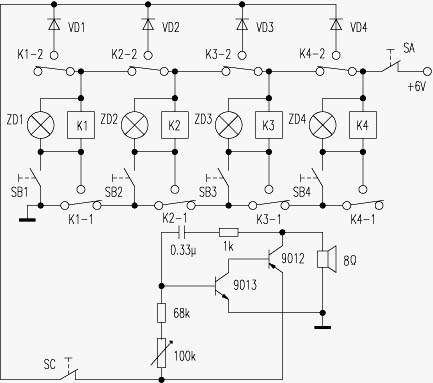 另一方法是改变电路的接法,如图所示。每个继电器用其两组转换接点。仍以第二组为例,当SB2按下时,K2吸合,灯ZD2亮,K2-1转换位置使K2自保,K2-2转换位置使讯响器发声,其余继电器电源均被切断,相应的抢答按钮不起作用。改变接法后,K2-2转换位置时没有使K2失电,因此K2能吸合自保。经这样改动后,该抢答电路仍不失为是一种简单、易制、可扩的优良电路。