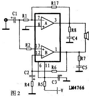 图2所示是LM4766的第二种BTL应用接法。A作为反相放大器,B作为同相放大器。A的增益为-R17/R1,B的增益为(R4+R6)/R4,可取适当的值使二者增益相等。由于A、B放大器的输入信号在相位上是绝对相等的,经过放大后相位即使有延迟,但只要延迟的相位相等,迭加后也不会存在相位混乱的问题。此电路的适应性很不理想。因为它对输入信号源的要求很高。信号源必须在电路上电前加入,而且内阻要足够小。在不接入信号源时,A作为跟随器将会输出一直流电压损坏喇叭。当信号源内阻太大时,A的放大系数会变小。此种接法适用于在电路中加有低输出电阻的前级的电路系统中。