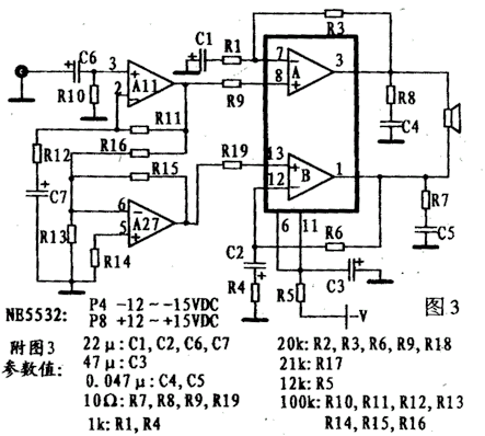 图3所示是LM4766的第三种BTL应用接法。电路中加有一块NE5532。它改善了图2接法中的不稳定性。NE5532的放大器 A11 为电压跟随器,A27为反相器。因此,LM4766的两个同相放大器的输入是反相的,它们的输出亦是反相的。在All中使用了C7电容,应此在A11的输出中是不含直流分量的,所以A27可采用直流负反馈,这使得 A27 的输出与 A11 的输出正好相差180°,因而不存在图1所说的相位延迟问题。同时由于NE5532的输出内阻是相当小的,它又解决了图2中不稳定的问题。只是电路中增加了一块IC,使电路的复杂程度有所提高。