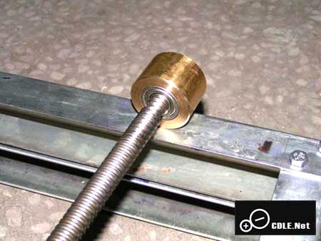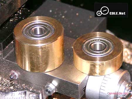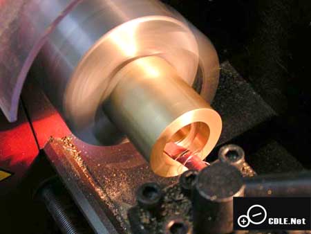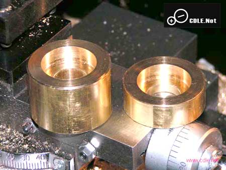 用C3车车加工丝杠轴承座,第一次做,整整做了大半天,用铜棒材料做了4个。不幸的是切割刀崩断了,后来只好用砂轮片切。 加工中