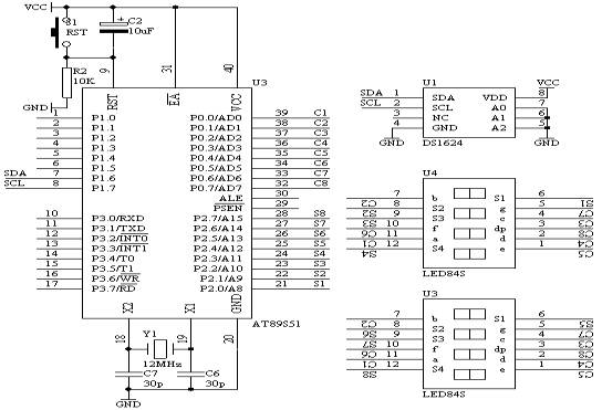 (1). 由于DS1624是I2C总线结构的串行数据传送,它只需要SDA和SCL两根线完成数据的传送过程。因此,我们在进行程序设计的时候,也得按着I2C协议来对DS1624芯片数据访问。有关I2C协议参看有关资料,这里不详述。对于AT89S51单片机本身没有I2C硬件资源,所以必须用软件来模拟I2C协议过程。