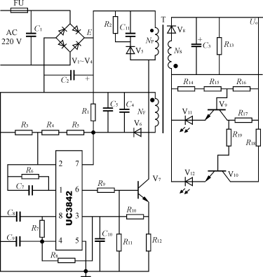 摘要:介绍一种用于手机和电动自行车的自动充电器电路。它省去了复杂的IC电路及其外围电路,同样可以完成对蓄电池进行自动充电的功能。 为了使手机、电动自行车等所使用的充电器实现自动充电的功能,大都采用各种各样的专用IC充电器集成电路和各种采样电路。本文介绍一种既能省去复杂的IC电路及其外围电路,又能够实现自动充电功能的电路。 1 工作原理 图1中C1、V1~V4、C2组成滤波整流电路,变压器T为高频变压器,V5、R2、C11组成功率开关管V7的保护电路,NF为供给IC电源的绕组。单端输出IC为UC3842,其8脚输出5V基准电压,2脚为反相输入,1脚为放大器输出,4脚为振荡电容C9、电阻R7输入端,5脚为接地端,3脚为过流保护端,6脚为调宽单脉冲输出端,7脚为电源输入端。R6、C7组成负反馈,IC启动瞬间由R1供给启动电压,电路启动后由NF产生电势经V6、C4、C5整流滤波后供给IC工作电压。R12为过流保护取样电阻,V8、C3组成反激整流滤波输出电路。R13为内负载,V9~V12及R14~R19组成发光管显示电路。图1中V5、V6选用FR107,V8选用FR154,V7选用K792。