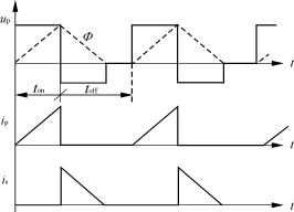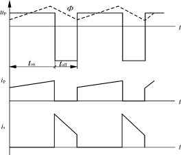 式中:RL——电路负载电阻; T=1/f——变压器工作周期。 式(5)中E、ton、T、Lp为定值,所以输出电压Uo随负载电阻RL的大小而变化,若忽略整流器件压降,则输出电压最大值应为: Uomax=(1/n)Up=(1/n)E (6) V7承受的反压应为: Ucc=E+Up=E+nUo (7) 3)toff<τ 各参数波形如图4所示。从图4中可以看出磁通在toff期间不能复位,ip也不是从0开始线性增加,is下降不到0,这种工作状态输出电压Uo应满足如下关系: Eton=(Np/Ns)Uot Uo=(ton/toff)(Ns/Np)E