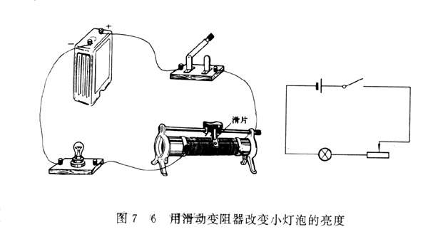 实验把一个叫做滑动变阻器的装置跟小灯泡一起串联在电路里,如图7-6所示.合上开关后,左右移动,同时观察小灯泡的亮度.